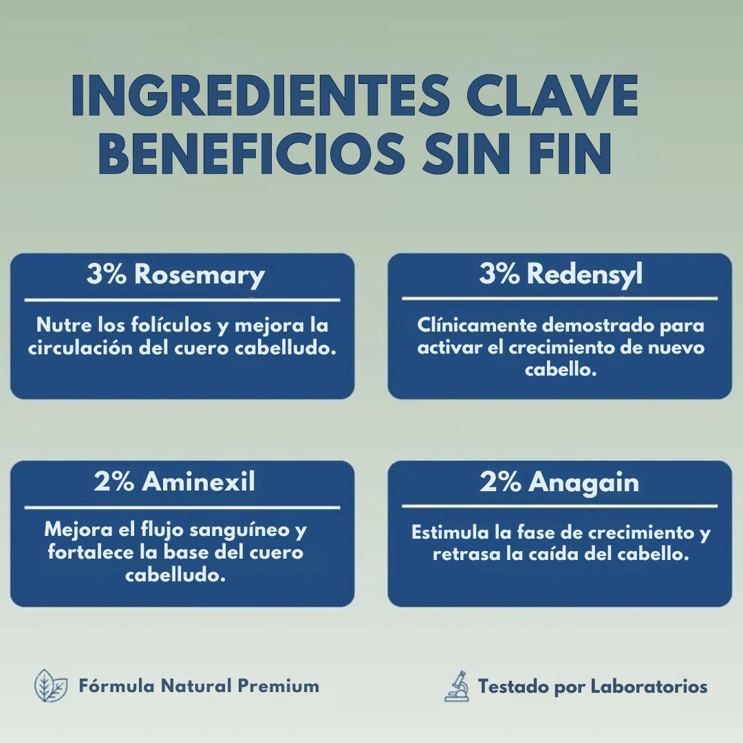 Formulado con ingredientes comprobados que atacan el adelgazamiento temprano del cabello desde la raíz — sin rellenos ni ingredientes de adorno.