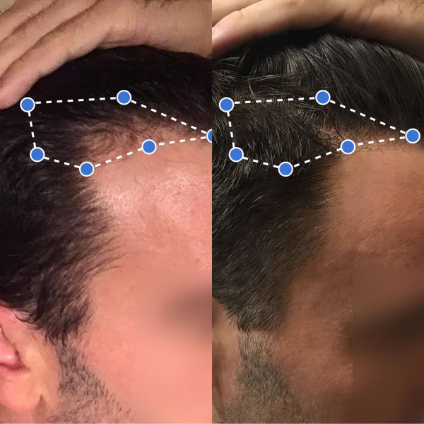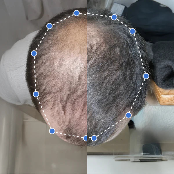 Tengo 25 años y noté que mi cabello se estaba debilitando hace 4 meses. Podría ser genético o poros obstruidos. Desde que uso esto es otra cosa, la gente ve que tengo el pelo más grueso. Incluso veo crecer pelo nuevo donde antes estaba mi antigua línea capilar.
